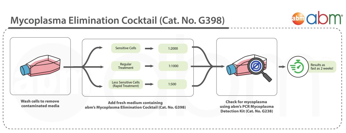 abm’s MycoAway™ Mycoplasma Elimination Cocktail (1000X) is a specially formulated agent to effectively clear cells from Mycoplasma contamination in both adherent and suspension cells. Mycoplasma contamination is currently the most prevalent contamination in all cell culture facilities around the world.