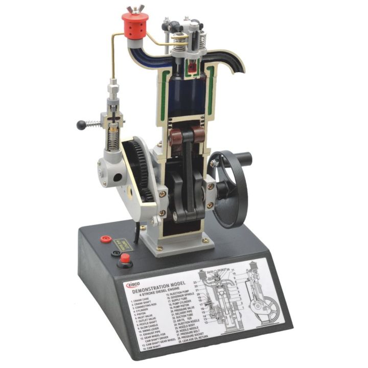 Shows internal structure and operating principles of a full-sized water cooled 4-stroke diesel engine. Camshaft, rock-arms, and tappets are clearly demonstrated. Also, the functioning of the fuel injection system is represented. Model includes cross sections of carburetor and fuel supply. A simulated spark plug (lamp) indicates the firing point. Lamp requires a 6- to 12-V power source (not included). Dimensions: model, 12 x 9 x 5"; base, 8 x 8 x 2-1/2". No assembly required.