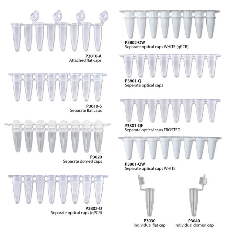 Pure•Amp™ 0.2mL PCR tubes and strips are available in seven different configurations, including single tubes, eight strips, domed caps, and flat caps. Optically clear caps and white tubes (for optimal fluorescence reflectivity) are also available for qPCR applications.